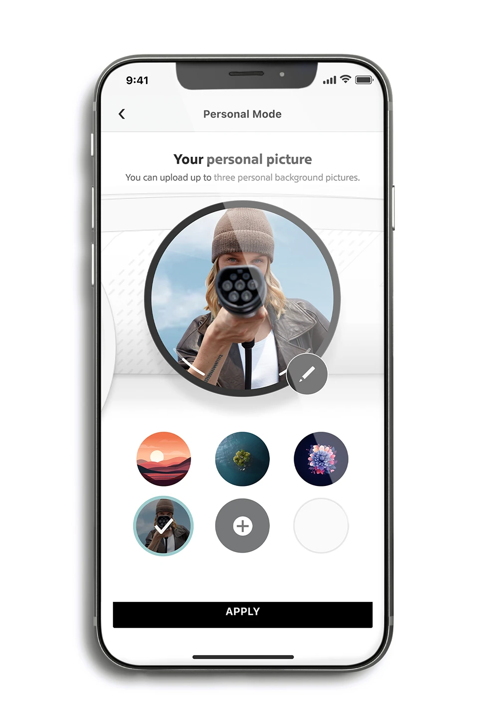 - Faites votre choix parmi les images par défaut. Ou bien chargez votre photo personnelle dans la voiture via la MINI App.